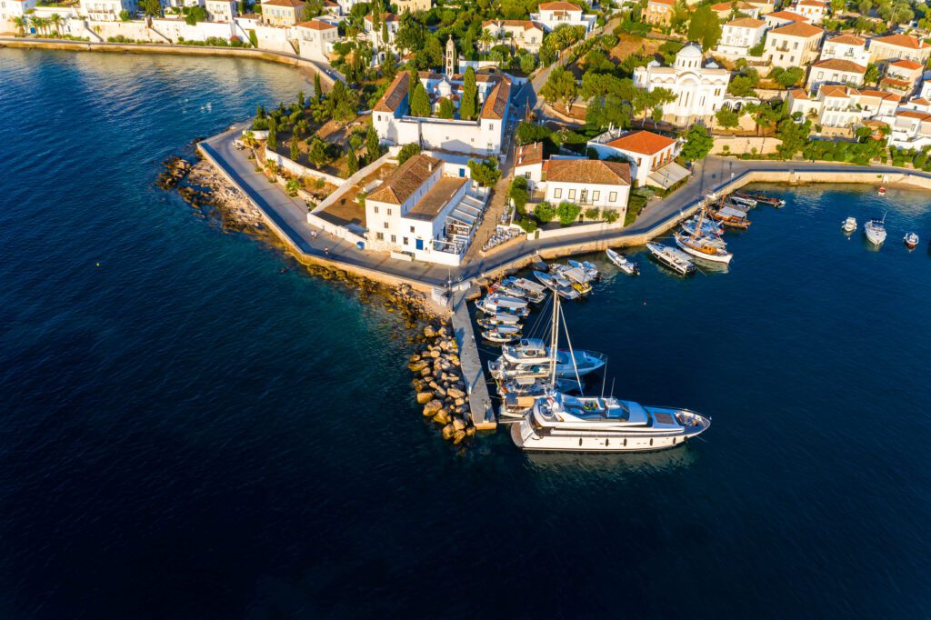 Vista aerea del porto turistico di Spetses, sullo sfondo la chiesa di Agios Nikolaos